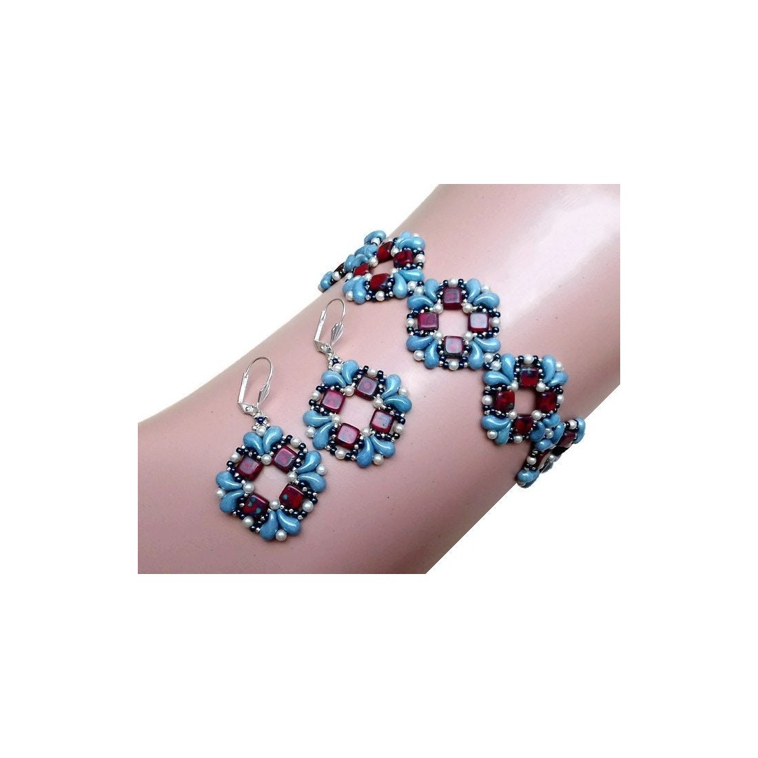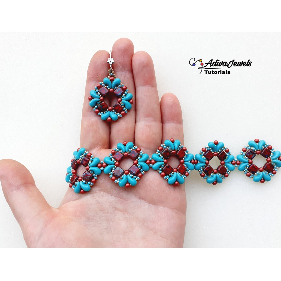 Create a beautiful DIY beaded jewelry set with this bracelet and earrings tutorial! Featuring Czech Tile beads, Zoliduo beads, round beads (or pearls), and seed beads, this beading pattern guides you through the process with detailed PDF, step-by-step instructions. Perfect for both beginners and experienced beaders, this beadwork design helps you craft an elegant, handmade jewelry set. Follow the easy-to-read pattern to create a stunning, coordinated look for any occasion. Download this beading tutorial today and start your next jewelry-making project! The bracelet presented here is about 6.7 inches (17 cm) long, without clasp, but you can make it longer or shorter by adjusting the number of motifs. One motif adds about 1.2 inches (3 cm) to the bracelet's length.